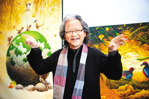十八日,七位来自马来西亚的画家在观澜湖·海口国际高尔夫度假区举办画作联展。这些画展以大自然为主题,展示了马来西亚热带风情。图为画家郑友强向观众介绍他的作品。 本报记者 李幸璜 摄