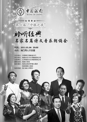 据悉,“中银之夜”是中国银行股份有限公司海南省分行冠名主办的一年一度的品牌演出,自2004年成功举办以来,以清新高雅的风格和品味赢得了社会认同。这次演出也是该行继第五届“中银之夜”《爱让我们在一起》经典朗诵会之后,再次邀请国内著名朗诵艺术家来琼演出。晚会由海南采艺文化传播有限公司承办。
