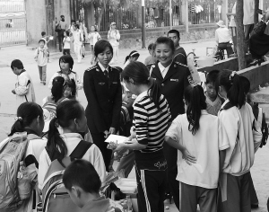 12月22日下午5点,正是放学时间,保亭小学门口,人头攒动,孩子们从校门蜂拥而出,围挤在校门口的路边摊旁。人群中,3个身穿城管制服的高挑女孩格外显眼。