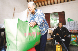 | ←文昌市文城镇北架黄村,陈振垂一家收到慰问团送来的爱心款物。