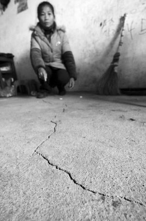 ↑会昌县周田镇新圩村村民罗凤用手指着家里出现裂缝的地面。