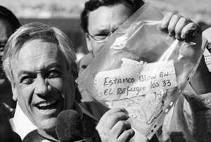 8月5日,位于智利北部阿塔卡马沙漠中的圣何塞铜矿发生塌方事故,33名矿工被困700米深井下。矿难发生后,智利政府立即承担起救援受困矿工的工作。智利总统皮涅拉8月7日当即中止对哥伦比亚的访问,赶赴铜矿事故现场,慰问受困矿工家属并监督救援工作。