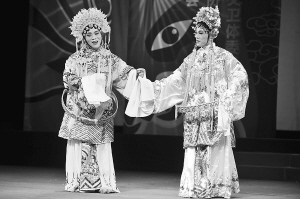 | 王文清和刘小江身着女装演唱《打金枝》选段 |
