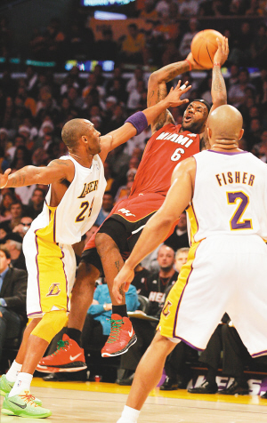北京时间12月26日,在NBA常规赛“圣诞大战”中,热火队客场以96:80大胜湖人队。图为科比(左)防守詹姆斯(中)。 新华社发