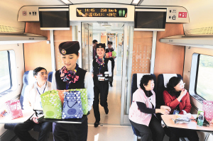 | 东环铁路列车员在为旅客服务。 本报记者 古月 摄 |