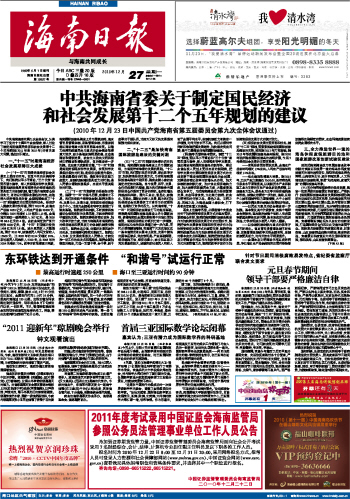 | 海南日报 头版 001 2010-12-271 2010年12月27日 星期一 |
