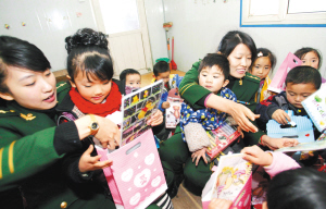 12月28日,女民警们为小朋友们分发新年礼物。 当日,山东青岛燕儿岛边防派出所民警来到志兴幼儿园,为外来务工人员的子女发放新年礼物,让孩子们感受到“第二故乡”的温暖,与他们共迎新年。 新华社发