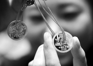 12月28日,北京菜百商场的工作人员在展示金、银压岁钱。 当日,由中国国家博物馆艺术品开发中心监制发行的2011版“中国纯金压岁钱礼盒”在北京上市。“中国纯金压岁钱礼盒”从2008年起发行,此次推出的是第四款。 新华社发