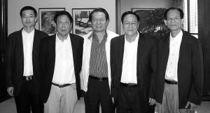 | 黄健中(中)与《丘濬》编剧安华涛、《邢宥》编剧贾长海、《海瑞》编剧程运行、潘正桐(左起)合影 |