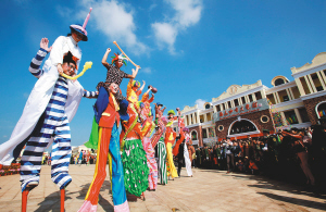 | 12月28日上午,第十一届海南岛欢乐节在澄迈福山咖啡文化风情小镇拉开帷幕。开幕活动现场,高跷杂技表演惊险、精彩。