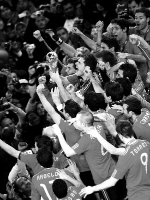 7月11日,西班牙队在2010年南非世界杯决赛上以1:0击败荷兰队,首次举起世界杯冠军奖杯,成为世界杯历史上第八支冠军球队。这是欧洲球队首次在欧洲之外荣膺世界杯冠军,也是欧洲冠军西班牙队首次进军决赛就成功问鼎。