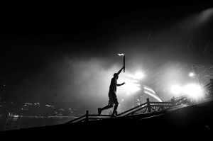 11月12日,第16届亚洲运动会开幕式在广州海心沙岛举行,第一棒火炬手吴国冲从水中上岸,高举火炬进入开幕式主会场。