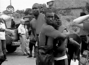 1月9日,参加非洲国家杯足球赛的多哥队球员在安哥拉的卡宾达省遭当地反政府武装袭击遇袭后相互安慰(电视截图)。