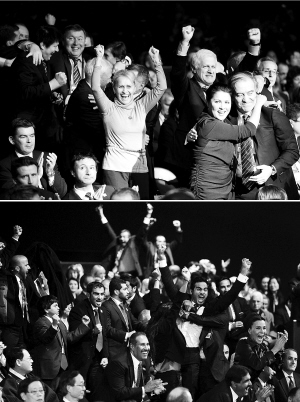 12月2日,俄罗斯申办代表团成员(上图)在揭晓仪式现场庆祝赢得2018年世界杯主办权。卡塔尔申办代表团成员(下图)在揭晓仪式现场庆祝赢得2022年世界杯主办权。