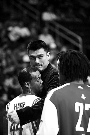 12月27日,在NBA常规赛中,火箭队主场战胜奇才队。中国球员姚明和易建联双双因伤缺阵。图为姚明与队友海耶斯拥抱。 新华社发