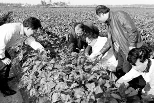 近日,琼海博鳌镇珠联村种植的甜椒、泡椒出现落叶、落果、枯死等现象。12月27日,省农科院蔬菜研究所组织专家实地观察确诊为“细菌性叶斑病”。专家提醒椒农要正确诊断病因对症下药。图为专家们在辣椒地会诊。 本报记者 苏晓杰 摄