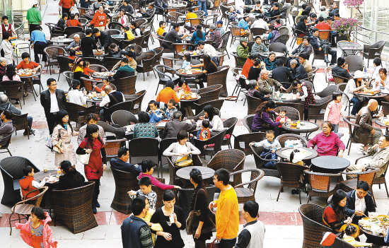 ↑海口骑楼小吃街的美味佳肴吸引众多食客。 本报记者 苏晓杰 摄