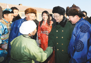 | 这是元月1日,温家宝来到宝力根苏木乌力吉德力格尔嘎查看望牧民。 新华社记者姚大伟摄 |