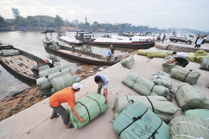 中国-东盟自贸区 “南新通道”在建设中 这是在广西东兴市边贸互市点,工人在中越界河北仑河码头搬运货物(2010年11月14日摄)。 2011年1月1日,时值中国-东盟自贸区成立一周年。随着“南新走廊”沿线工业基地、商贸基地、物流基地和信息基地的逐步建立,在“南新走廊”沿线正在崛起一条经济增长带。 新华社记者 黄孝邦 摄