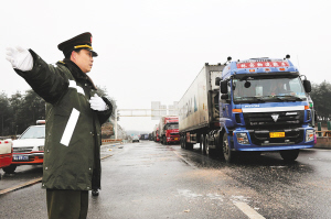 | ← 1月3日,贵州省高速公路管理局的路政人员正在疏导车辆通行。