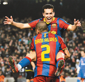 北京时间1月3日,在西甲联赛第17轮比赛中,巴塞罗那队主场以2:1战胜莱万特队。图为巴塞罗那队球员佩德罗(上)进球后与队友阿尔维斯庆祝。 新华社发