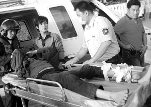 | 左图:腿部受伤的渔民被送到三亚接受进一步救治。 通讯员 欧昶辉 摄 |