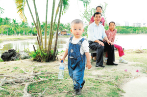 1月2日,来自湖南常德2岁的小游客胡里奥在三亚白鹭公园拎着矿泉水瓶到处找垃圾桶。 本报记者 苏建强 摄