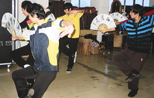 | ↑海口市艺术团演员在排练网络春晚快板书节目舞蹈。