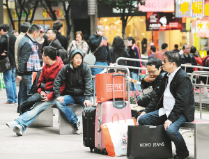 1月3日,内地游客购物后在商场外休息。 受惠于内地赴港个人游放宽及赴港购物团增加,香港各大商场元旦期间“丁旺财旺”,成为新年的商业“赢家”。自新年除夕至元月2日的3天,仅新鸿基地产旗下的12个商场总人流即达450万人次,营业额8300万港元,同比去年分别上升17%和21%;信和置业旗下的屯门市广场新年2天录得76万人次客流,内地个人游消费者自去年12月以来更急升逾20%。 新华社发