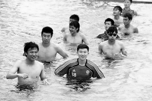 | →1月3日,在多哈备战亚洲杯的国足获得了宝贵的半天假期。图为国足队员游泳放松。 小新发 |