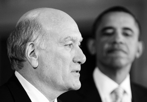 1月6日,美国总统奥巴马任命摩根大通公司高管、前商务部长威廉·戴利(左)为新任白宫办公厅主任。白宫办公厅主任也称白宫幕僚长,是美国总统办事机构的最高级别官员。任命新办公厅主任被认为是奥巴马在中期选举后改组白宫领导班底的重要一步。 新华社/法新