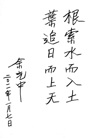 我曾经为人题过两句话:根索水而入土,叶追日而上天。这就是我的两句诗。一棵树根要求其深,可是叶子跟花应该要求其高。