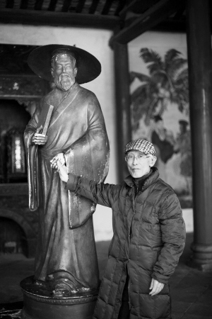| 余光中游五公祠时特意与苏东坡塑像合影。张字延 摄 |