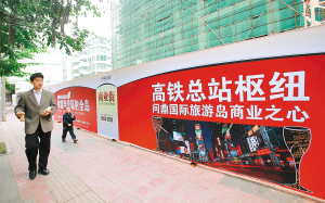 东环铁路的开通带动了沿线房地产的发展,在东环铁路海口东站附近的某房地产小区就借助靠近高铁的地理优势,打出相关广告吸引客户。 本报记者 张杰 摄