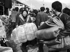 1月9日,甘肃舟曲遭遇火灾群众在领取救灾物资。