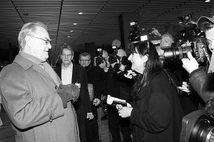 1月8日,在丹麦首都哥本哈根,双胞胎的爷爷、丹麦女王的丈夫亨里克亲王(左一)到医院看望王储妃后接受媒体采访。