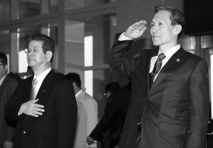 | 1月10日,韩国首都首尔,日本防卫大臣北泽俊美(左)与韩国国防部长官金宽镇在欢迎仪式上。 新华社发(朴真熙摄) |