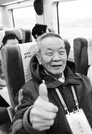 | → 92岁的黄运明曾是琼崖纵队第一团的一员,1985年离休前是海南区党委农村工作部副部长。作为老干部乘坐东环铁动车组体验活动的最大龄参与者,车上悠闲舒适的感受,让黄运明竖起了大拇指。