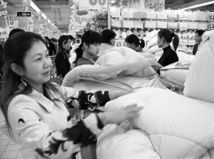 连日来的低温天气导致海口各大商场御寒商品热销。图为海口市海府路某超市销售棉被、棉衣的热闹场景。 本报记者 古月 摄