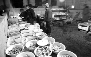 | 在一元钱农民公寓内的简易饭店中,工人在点菜。