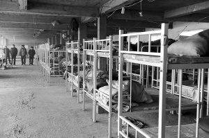 李大国介绍,一元一天的铺位主要在大楼2层至5层的大厅里,另外还有些单间。在农民工兄弟的带领下,记者看到,大厅的面积超过600平方米,厅内有4列、每列有20多张上下床;大厅还有一些地铺,但现在没人睡。一些床上铺着政府相关部门赠送的绿军被,另一些床上铺着农民工自带的被褥。