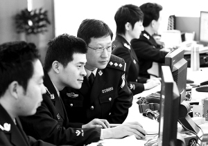 1月12日,网络红人“奔奔交警”林祁斌(左三)、“最帅交警”陈栋(左二)在微博上观看网友留言。 当日,上海12位公安知名民警成为“微博达人”,在东方网上开通微博,与网友分享工作中的点滴感受,解答老百姓心中的疑惑,从而搭建起促进警民互动的新平台。 新华社发