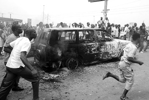1月13日,在科特迪瓦阿比让,联合国驻科特迪瓦行动团的一辆汽车被抗议者烧毁。 据报道,阿比让当日上午发生6起针对联合国维和人员的袭击事件。其中,联合国驻科特迪瓦行动团(联科团)的一辆军车被烧毁,一辆救护车上的司机和一名医生受伤。 新华社发