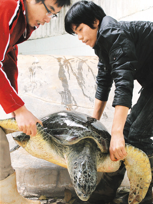 图为工作人员在搬动绿海龟进行救治。 本报记者 苏晓杰 摄