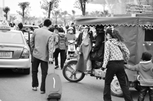 非法营运的摩的、人力三轮车不时穿插其中,卖水果的小商小贩也见缝插针,鸣笛声、叫卖声、市民的抱怨声此起彼伏。整个站前广场一横路,就像一个乱哄哄的农贸市场。这是16日上午11时,海南日报记者在东环海口东站站前广场看到的情景。