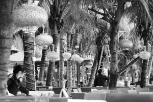 1月16日,大东海畔,一只只金黄色的大灯笼,挂在了海边酒巴街的椰树之上。商家们提早布置节日景观,准备迎接春节游客的到来。 特约记者 孙清 摄