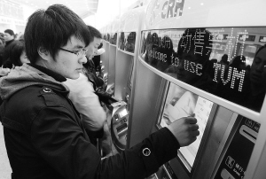 1月16日,旅客在合肥火车站使用动车自动售票机购票。 当日,合肥火车站8台动车自动售票机开始启用,旅客可直接在屏幕上选择目的地,售票机将分别列出车次,供旅客选择。动车自动售票机使用起来方便迅捷,能有效分流购票旅客。 新华社发(马启兵 摄)