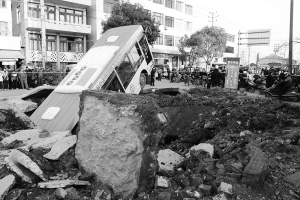 道路爆炸 瑞安公交车栽大坑 1月16日,浙江省瑞安市东山瑞光大道路面发生爆炸,路面被炸出一个大坑,一辆路过的无乘客的公交车被气浪掀起后掉入大坑中,公交车司机及路边一名6岁男孩受伤。事故原因还在进一步调查之中。 新华社发