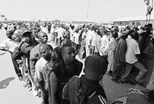 1月15日,在尼日利亚阿布贾的一个选民登记中心,选民们排队等候。当天,尼日利亚开始进行选民登记。尼将于今年4月9日举行总统选举。 新华社/路透