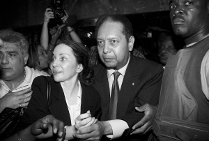 1月16日,海地前总统让-克洛德·杜瓦利埃(右二)在太子港一家酒店现身。 海地前总统让-克洛德·杜瓦利埃当日突然结束25年流亡生涯,回到首都太子港。杜瓦利埃父子从1957年到1986年先后担任海地总统,被政界和舆论界认为是“家族独裁者”。1986年阿里斯蒂德在大选中首次获胜出任总统后,让-克洛德·杜瓦利埃流亡国外。 新华社记者 王沛 摄
